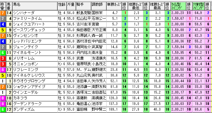 1番人気に支持されている14番シンハナーダですが、単勝オッズ4.7倍、複勝オッズ2.3倍という構成を見ると、オッズ面からは極めて不安定な人気と言えます。