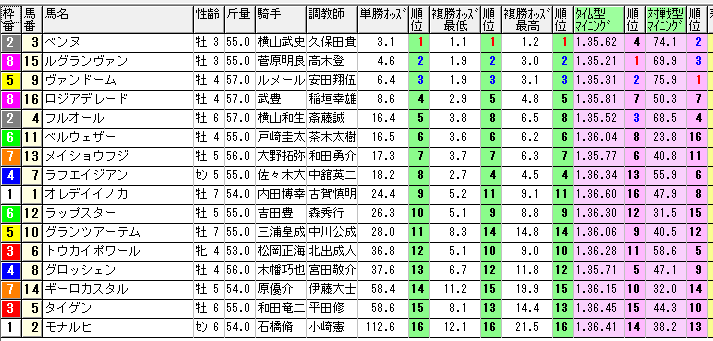 1番人気3番ベンヌ馬は単勝3.1倍・複勝1.1倍という数値。