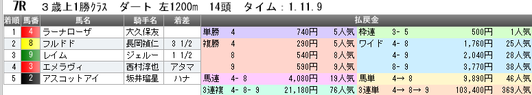 <中京7R>◇7日◇1勝クラス◇ダート1200メートル◇3歳上◇出走14頭
