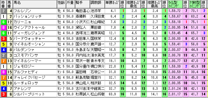 3番人気の12番カリーニョで複勝オッズ2.2倍もよく、データマイニング指数も1位なので